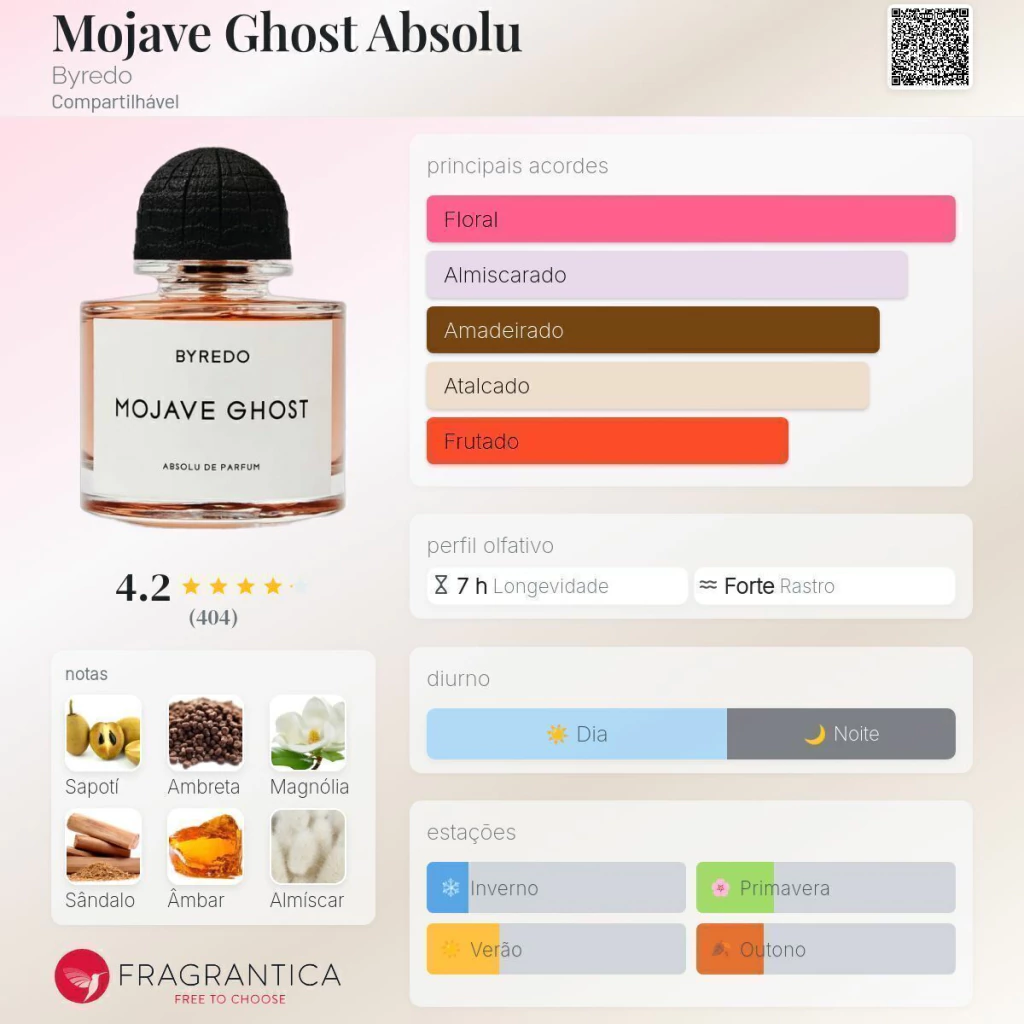 Mojave Ghost Absolu de Byredo é um perfume Floral Amadeirado Almiscarado Compartilhável. Esta é uma nova fragrância. Mojave Ghost Absolu foi lançada em 2024. As notas de topo são: Sapotí e Ambreta. As notas de coração são: Magnólia, Sândalo e Violeta. As notas de fundo são: Âmbar, Almíscar e Cedro.